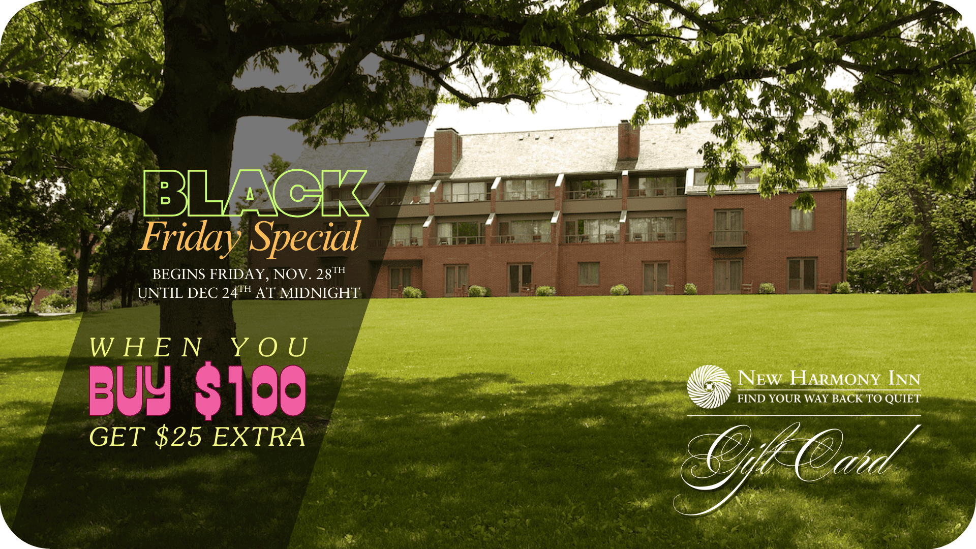 Indulge in our Black Friday Gift Card offer, available until Dec 24th! For every $100 spent, receive an extra $25 gift card—perfect for treating yourself or sharing the joy! Whether for birthdays, anniversaries, or any special occasion, the versatile New Harmony Inn Resort gift card is a cherished gift usable at the Inn, Red Geranium Restaurant, Grapevine Bar, and for golf cart rentals, starting at $25.